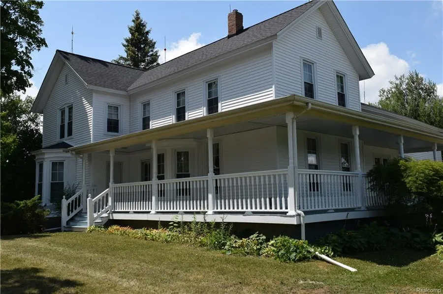 Updated 1850 Historic Home with 260 ft of road frontage with almost 2-acres. Oak Floors, Large rooms, Oak Kitchen, New roof and siding keeping your exterior maintenance to a minimum. Huge wrap around porch along with a large deck area on the back. Inside is full of charm and architectural features, Large rooms throughout. Home also has an 240 sqft in-law apartment with separate entrance. If youre looking for lots of storage this is for you, your cars, boats, campers, wood working shop and so on with endless possibilities. This property comes with a 32x40 2-car garage with 390 square foot upstairs Carriage house apartment, 32x40x12 Pole Barn, and 2nd 32x40x12 Pole Barn, all three buildings are separately metered. Property also has a 21x17 road side Market type structure. Must see to appreciate this property.
