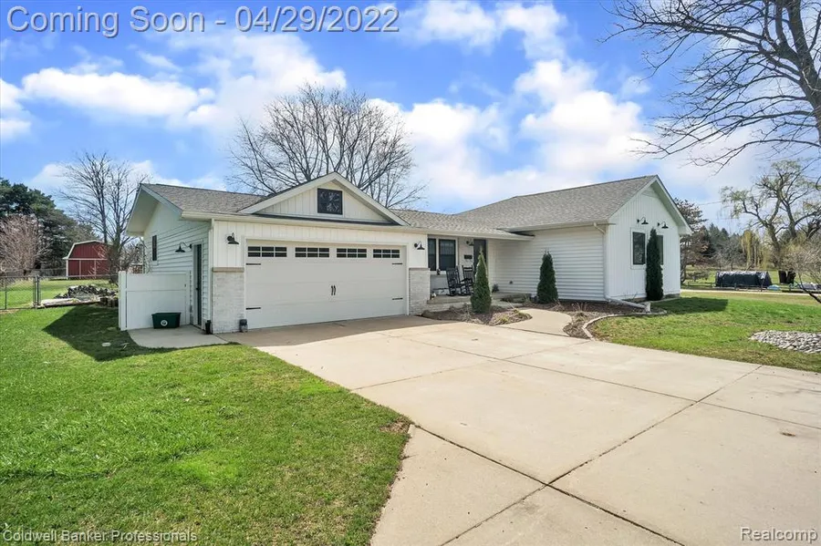 This gorgeous ranch residing on a 1 acre lot was completely renovated in 2018 including new roof, windows, siding, stamped patio, and sidewalk. The home also features an additional 352 sq ft that holds the primary bedroom with an ensuite and walk-in closet. The kitchen has matching slate appliances, concrete counters, a large island with storage and seating, that leads into the living room which has beautiful built-ins offering lots of storage. The backyard is fully fenced in and includes a 16x20 pole barn with electricity and a loft.