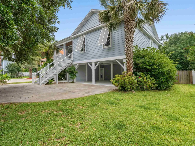 Check out this lovely raised beach house in the heart of Murrells Inlet. Just a short walk or golf cart ride to all the restaurants and the Marshwalk and just minutes to Garden City Beach or Huntington State Park. This home is a 4 bedroom 3 bath with two master suites (one on the main floor and one on the ground level). The home has had extensive cosmetic upgrades since 2018 and features cool gray and blue tones with white, black and natural wood accents. The kitchen was completely remodeled in 2020 and features stainless steel appliances, quartz countertops, stacked shaker style cabinets, a cypress shiplap backsplash and a black shiplap island with black composite farm style sink. New LVP was installed throughout the upstairs, except bathrooms in 2020 as well. All bathrooms feature tile floors. The downstairs master bedroom floors are engineered hardwood and were replaced in 2018. The downstairs master bedroom also features an upgraded trim package featuring white shiplap contrasted with charcoal blue accent walls. There is direct access to a screened porch and the back yard from the master bedroom. Entire exterior of home and shed were repainted in December of 2021 range and over the range microwave were replaced in late 2022. Dishwasher was replaced in 2018. New water heater was installed in 2023. The fenced backyard features a large shed with cabinetry currently configured for use as a workshop and home gym. There is also a raised bed garden area. Range, microwave, dishwasher and front load washer and dryer convey. The two refrigerators and remaining TVs DO NOT convey. Square footage is approximate and not guaranteed. Buyer is responsible for verification. Seller is licensed SC real estate agent.