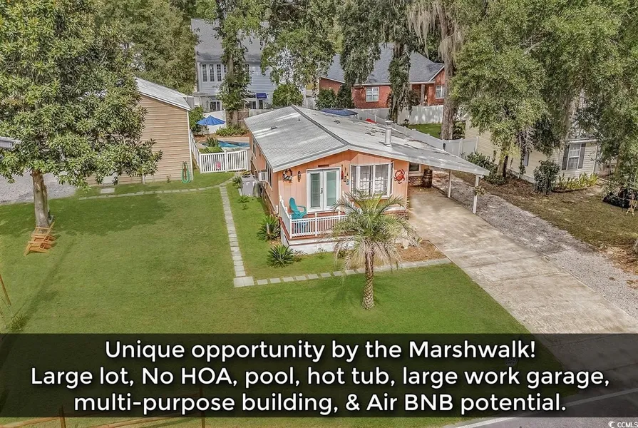 Tucked away in the heart of Murrells Inlet, this property offers the best of Lowcountry living with privacy, space, and unbeatable convenience. Situated on a large lot with fencing and natural buffers, you’ll feel a world away while still just a short walk to the famous MarshWalk, or a quick golf cart ride to all the local staples, shopping, and dining that make this area so special. With no HOA restrictions, you’re free to enjoy your home and land as you please. The residence features a separate mother-in-law suite that has long served as a successful Airbnb rental, complete with its own added bathroom, making it perfect for guests or income potential. A brand-new shed with electricity, a window unit, and a washout is ready to become the pool house you’ve envisioned. The outdoor oasis already boasts a swimming pool, patio, hot tub, and gazebo, ideal for gathering with family and friends after a day on the water. Inside, the owners have invested heavily since 2017 to transform this home, with updates including new kitchen cabinets, countertops, flooring, lighting, and ceiling finishes, along with a fully renovated master bathroom. Both living and dining areas have been refloored, bedrooms refreshed, and windows and French doors replaced to brighten every corner. A large outdoor garage/workspace with a lift and full bathroom adds unmatched utility, while providing many other special-purpose uses in addition. Recent upgrades ensure peace of mind: a new HVAC (2023), new metal roof (2023), freshly repainted exterior (2025), and sealed concrete driveway and patios. Even the decks and porches have been refinished for a move-in ready experience. With grinder pumps installed for reliability and meticulous care given to every detail, this property blends function with charm. Whether you’re looking for a private retreat, a flexible multi-use layout, or a true Murrells Inlet lifestyle where the beach, hospital, and all conveniences are within easy reach (this home delivers it all!) -Please note: this homes offers central HVAC. The additional window units are only there due to air bnb downstairs (providing the ability to increase or decrease temperature since the home is on one central unit).