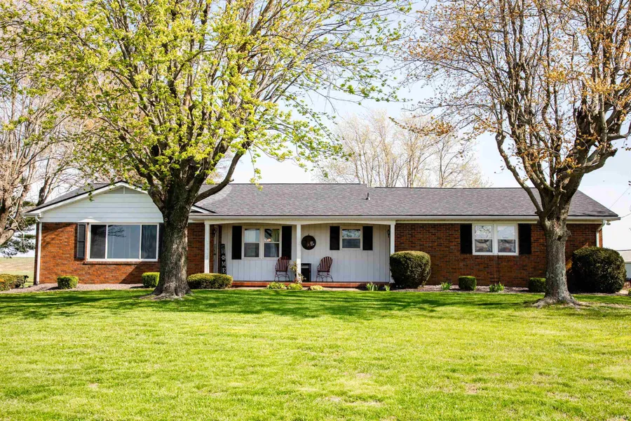 Country living on 4 acres on the Northern edge of Vanderburgh Co. just one mile from the I-64 interchange. This well cared for home has been owned by the same family since 1970, and features some recent updates! New septic system (2024), two of the three full bathrooms have been remodeled, new roof (2023), new overhead garage door openers (WiFi and camera), and vinyl replacement windows. The traditional floorplan offers a covered front porch entry into the front living room with lots of windows and natural light. Kitchen is open to the dining area with a breakfast bar for 3-4 stools. Efficient kitchen layout with electric cooktop, wall oven, and new French door refrigerator. Access the attached, oversized 2 car garage (24x30) and rear covered porch for views of the rolling countryside. The back property features a dirt race track for summer fun! Large pole barn with electric and concrete floor offers a variety of uses for storage, animals, vehicles, workshop, farm equipment, etc. Back portion of the property has been farmed in the past. The full basement offers wide open semi-finished space for rec room with a concrete coated floor, and an additional space for storage. There is a third full bathroom with walk-in shower, laundry/utility room, and access to the backyard from the basement. Homebuyers warranty included.