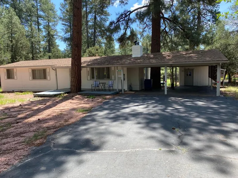 Updated home on a .329 acre lot on a Tall Pine lot with 2 bedrooms 2 bathrooms, and a den /office that could be made into an additional bedroom. Home appears to be larger than 1344 s/f shown in County records ,buyer to verify square footage. Large Primary Suite with huge walk-in closet, and updated bathroom. newer updated flooring through out home . Updated kitchen with newer appliances , newer fans and light fixtures, and newer blinds and window coverings. Beautiful Stone wood burning fireplace in Living room with Stone hearth and Wood mantle. Large covered front porch, and front yard Gazebo. 2 Car carport with large storage/shop area in rear. This is a beautiful home nestled in massive Pines. Come and see it , you will love it. Most furniture is available outside of escrow.