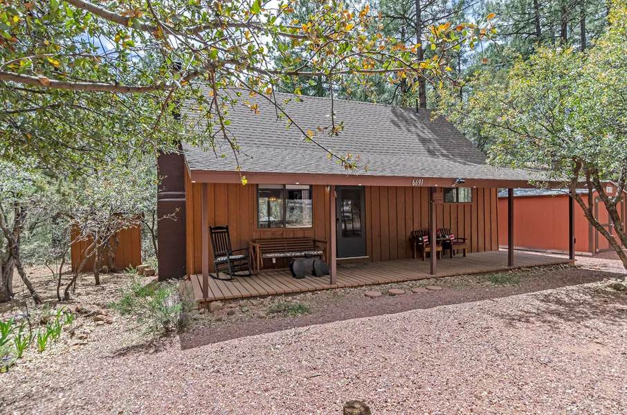 Surrounded by tall Ponderosa Pines, this well-maintained cozy mountain cabin is completely furnished and ready to enjoy! The cabin boasts knotty pine accent walls and kitchen cabinets, tile countertops, native stone fireplace, and an additional sun/media room with sliding glass doors opening to the back deck. Guest bedroom & bath on main level. The spacious bedroom suite upstairs has beautiful t&g walls and ceiling with a full bathroom and sitting area. Enjoy the wildlife and outdoors from the welcoming covered porch, grilling on the back deck, or roasting s'mores over the firepit. Stackable washer/dryer, new Tuff Shed for ATV parking or storage, wood shed, partial split rail fence, new refrigerator and water heater. No HOA. This one won't be available long!