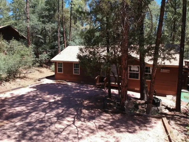 Here is the furnished turn-key ready cabin in the tall pines you have been searching for! Sitting on almost 1/2 acre, this carefully maintained cabin has 2 bed/2 bath with an adorable bonus room set up with bunk beds behind a wooden barn door. Primary bedroom has ensuite bathroom with walk-in shower and a custom vanity. Large kitchen with lots of counter and cabinet space and a separate dining area. Laundry room has full washer/dryer and don't miss the fun hallway closet equipped with a loft bed. Enjoy the cool summer nights and visits from wildlife on the large covered wrap-around patio or sitting around the firepit area in the large backyard. The exterior boasts ample level parking, swings in front trees, extra tuff-shed storage and fenced dog run or recreation area. No HOA