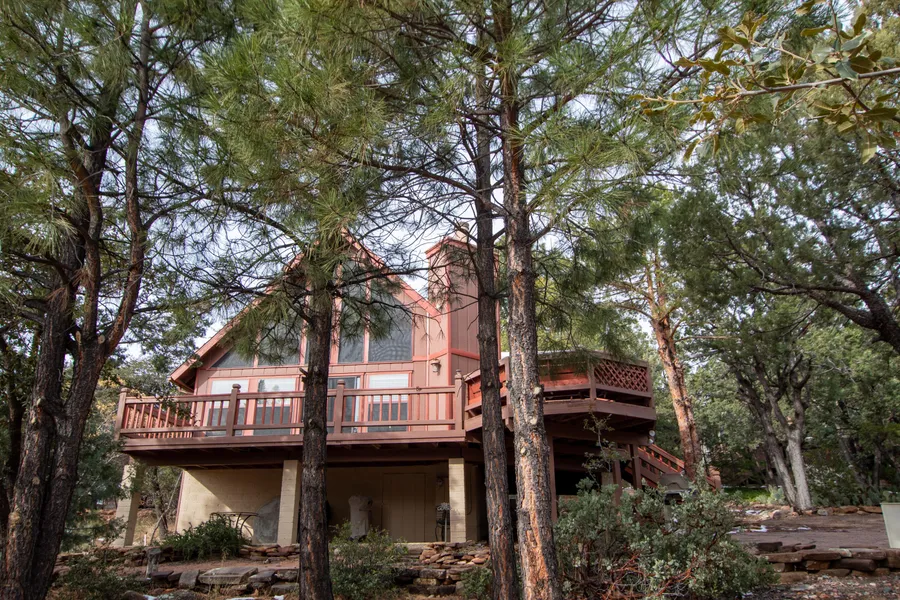Rich with exterior features. Mountain views! This appealing 3-bedroom, 2-bathroom Chalet style cabin is a special charmer in the Portals 2 area, known as a desirable location. Across the threshold, nice touches include hardwoods in foyer, kitchen and living spaces, stylish lighting, and a wood burning fireplace in the living room. The kitchen offers culinary promise, with natural light, fresh updates, stainless steel appliances, and granite counters. The restful primary bedroom includes a walk-in closet and private bathroom. The other two bedrooms, conveniently accessible from the main floor. Exterior includes decks and fire pit to keep conversations warm into the evening, The home is located on a quiet, low-traffic street. You'll enjoy spectacular panoramic views of the mountains.