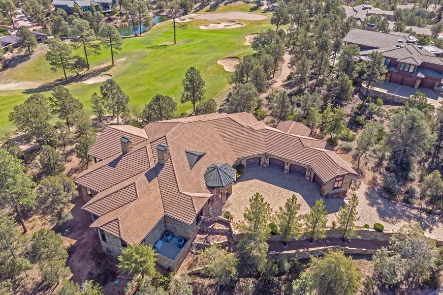 Escape to the perfect golf retreat set in the cool pines of The Rim Golf Club. This impeccable Mountain home offers single level living on the 5th fairway with a lake and Mountain views. Unique and one-of-a-kind this custom-built residence is a rare single level. Enter the home from the copper roofed front porch through the impressive large entry, tiled and solid hardwood walnut flooring, large beams, vaulted tongue & groove ceilings, stone fireplace, floor to ceiling windows with pocket door slider system that slides into the walls with electric screen. Enjoy the bar area with granite countertops, seating, ample shelving and storage, half dishwasher, ice maker and beverage cooler. The open concept with gourmet kitchen, gorgeous granite countertops, sub-zero refrigerator, dual sub-zero refrigerated drawers, ice machine, Wolf six gas burner and pancake stove top with dual ovens, warming drawer, custom ventilating hood, wolf microwave, Bosch dishwasher, breakfast bar, kitchen island, walk in pantry with lighting, eat-in dining and separate formal dining with tiled and walnut inlayed flooring, oversized wood beams and large window & draperies. Several walls are finished with elegant Venetian Plaster.