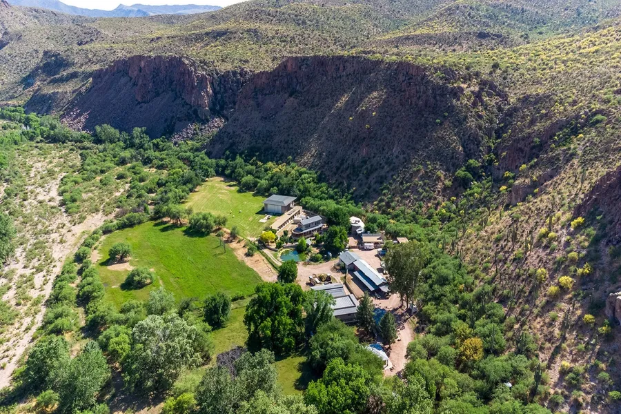 100% surrounded by Tonto National Forest, this 30.92 acre ranch sits down in a private canyon with Cherry Creek running through year round! This property has a total of 17 structures totaling over 34,000 sqft, six of which are livable including a 6 bed/6 bathroom bunk house with a large kitchen dinning & bar/game room upstairs, a 3 bed / 3 bath house, two different 2 bed / 1 bath houses, a 3 bed / 1 bath house and a 1 bed / 1 bath house. Other buildings include a 6,750 sqft fully enclosed hanger, 3,250 sqft equipment shed, 2,250 sqft green house, 3,200 sqft 13 bay garage, hay barn, 2 gazebos, and other sheds. This ranch is totally off the grid running off solar panels and large generators. About 15 miles east of Roosevelt Lake and just 1/4 mile North of the Salt River Wilderness Area!!