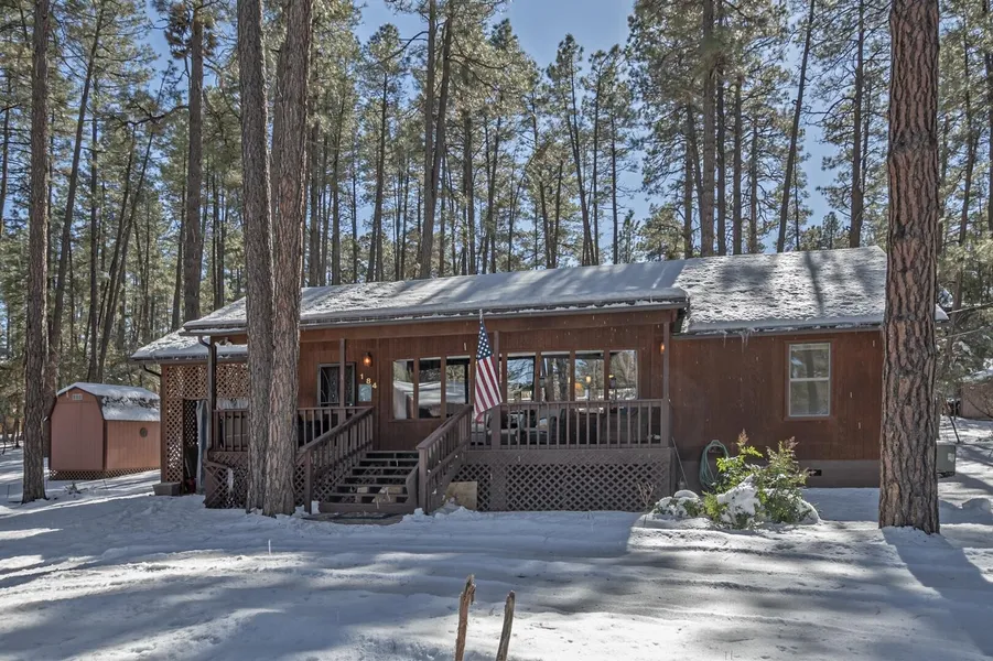 Welcome to this charming cabin nestled in the midst of tall pines. As you step inside, you'll be greeted by an inviting open floor plan that seamlessly blends the living, dining, and kitchen areas. The cathedral ceiling adds a touch of spaciousness, creating an airy and comfortable atmosphere. The wall of windows provides a view to the picturesque surroundings. The natural light creates a warm and inviting ambiance along with the pellet stove. The kitchen has been thoughtfully updated with new cabinets, featuring ample storage space and upgraded appliances. You will love the wood tile flooring! This cabin has 2 bedrooms providing comfortable accommodation, along with an additional office/den space. Both bathrooms have been tastefully update. A large detached oversized 2 car garage provides plenty of space for your vehicles and additional storage needs. The well maintained house includes a new roof installed in 2014, recent exterior and interior staining/painting and replacement of bedroom carpet. The hot water heater was replaced in 2020. Enjoy the tranquility of the outdoors from the great front and back covered porches, perfect for relaxing and taking in the fresh mountain air. A shed is conveniently available for extra storage. Whether you're seeking a full-time residence or a weekend getaway, this cabin offers a perfect blend of comfort, style, and beauty in every detail.