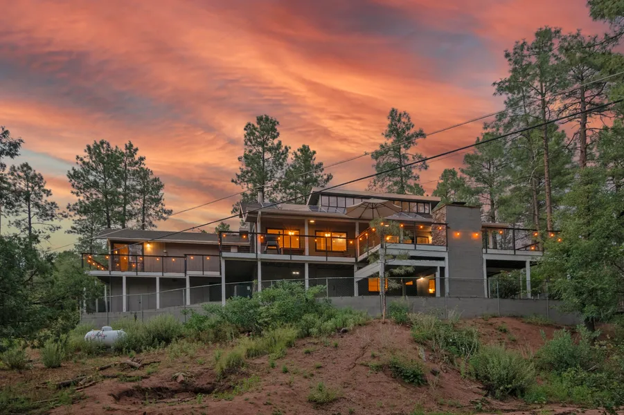 Welcome to your dream home! Nestled amidst towering Ponderosa Pines and close to the newly developed Granite Dells Park, this tranquil haven awaits its new owner. As you step through the threshold, you are welcomed by an inviting entryway that sets the tone for the rest of the home. The kitchen, a delight for culinary enthusiasts, has been thoughtfully upgraded with an induction range, double oven, quartz countertops, and ample storage space to cater to all your cooking needs. Thanks to the gorgeous bay windows, the dining area is bathed in natural light. The inviting great room, with its soaring ceilings, cozy woodstove, and floor-to-ceiling glass windows, seamlessly blends indoor comfort with the breathtaking beauty of the Rim Country. The primary bedroom, conveniently located on the main level, features generous storage options and an ensuite with a spacious walk-in shower. Descend to the lower level, where you'll discover a versatile space perfect for a game room complete with a convenient half bathroom. The main house boasts an impressive 3,138 square feet of living space, offering ample room for relaxation and entertainment. Step outside onto the expansive trex deck that wraps around three-quarters of the house, providing the perfect setting for outdoor enjoyment. Soak in the soothing waters of the hot tub or gather around the gas fireplace, relishing the harmony of your surroundings. This dream property also includes a delightful two-bedroom, full-bathroom guest house, complete with a large open deck, situated above the two-car detached garage. The guest house offers an additional 900 square feet of living space, ideal for accommodating guests or a home-based business. Nestled on a sprawling 1.33+/- acres within the prestigious Granite Dells Estates, this property enjoys the privacy of adjacent undeveloped land and is fully fenced for added security. An outbuilding with a window AC unit provides additional storage space, whether for hobbies or extra belongings. The private well has undergone rigorous testing and delivers superb water quality, ensuring a reliable and refreshing water supply. Additionally, a crawl space and large utility room with built-in shelving offer even more storage options, maximizing the functionality of this forest retreat. This exceptional mountain abode is ready to welcome its new owner and promises an idyllic escape from the hustle and bustle of everyday life perfect to create lasting memories.