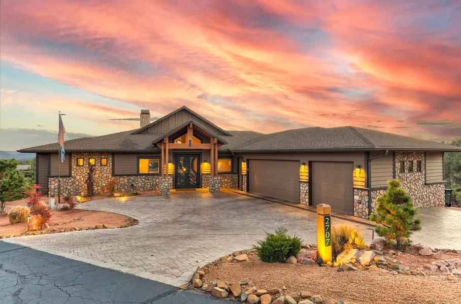 Experience luxurious living and breathtaking views in this stunning home on a cul-de-sac, situated along the third fairway of the prestigious Chaparral Pines Golf Club. Designed for main-level living, the 2,892± square foot main floor boasts an expansive great room with soaring vaulted ceilings, tongue-and-groove woodwork, and an eleven-foot pocket glass slider that seamlessly blends indoor and outdoor spaces. High-end finishes include hand-scraped wood flooring, slate tile accents, a custom steel front door, a striking stone fireplace (that can be wood burning), and an entertainment center. The gourmet kitchen is a chef's dream, featuring a large island, Frigidaire Professional Freezer/Refrigerator (separate units), custom alder cabinetry, granite countertops, and premium Monogram appliances, including microwave, a five-burner propane cooktop, warming drawer, and more. The private primary suite includes 10-foot ceilings, a spa-like bathroom with dual vanities, a soaking tub, a large dual-head shower, heated flooring, and a walk-in closet with built-ins. A powder room and an ensuite guest room complete the main level. Step onto the 972± sq ft low-maintenance Trex deck to enjoy the unparalleled natural beauty and mountain views. The 1470± square foot lower-level features game room with a custom bar, granite countertops, a copper sink, refrigerator, and icemaker, along with a state-of-the-art theater room that includes a projector, a 120'' screen, eight leather recliners, and surround sound. Two additional bedrooms complete this level. Additional highlights of the home include a three-car garage with epoxy flooring and built-in cabinetry, a cart barn and workshop, whole-house water filtration and softener systems, a geothermal electric heat pump with three zones, energy-efficient Sierra Pacific windows, 2 on demand (Navien) hot water systems, and foam insulation. The exterior features professional landscaping with drip irrigation and lighting, a 22KW Generac backup generator, buried 1000-gallon propane tank, a golf putting green with chipping tees, a paver driveway, and real stone veneer with Hardie Artisan siding. This meticulously crafted home also includes a security system, countless thoughtful upgrades, and is truly one of a kind. All mounted TV's including TV in great room will convey at close of escrow. Furniture available by separate agreement separate from escrow. Trailhead Membership is required at closing (7,500) with monthly dues thereafter. Schedule your private showing today to experience the elegance and charm of this exceptional home!