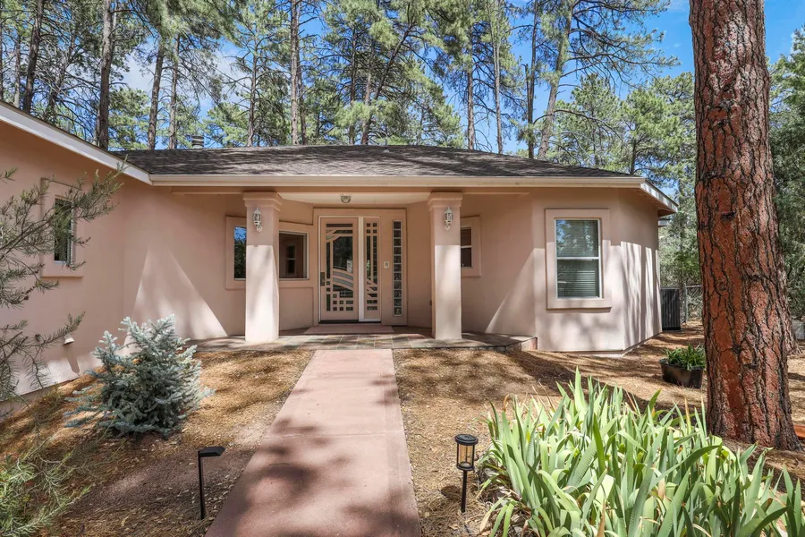 Unique custom home located on a heavily wooded 1 acre lot. Close to 100 large Ponderosa pines, some 70ft tall, providing shade and seclusion. Main level living with a great room, kitchen, dining room, sunken sunroom, master bedroom and second bedroom. Main level living is mostly solid red oak flooring. Separate bedroom and family room area upstairs. Nice private covered decks. Property is completely fenced with chain link and wrought iron. Large 1000 sq ft workshop that has unlimited uses. It would be a great quilting space, woodworking shop or add water and sewer and have a great guest house. Greenhouse included. Several fruit trees and garden plots on the property. Fireplace in the Great Room and master bedroom. This is a one of a kind home in a great area!