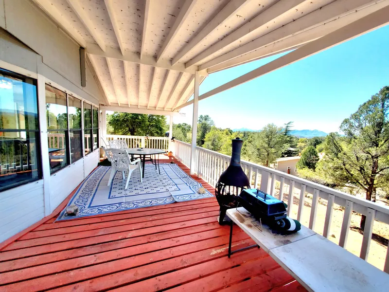 Panoramic Mountain Views await you from both your living room, dining room and large covered deck that's perfect for entertaining & watching beautiful sunsets! This 1534+/-sq.ft. 2 bedroom, 2 bath home features a large primary suite with vaulted ceiling, large closet & primary bath. Kitchen features include ample counter space & cabinets, dual pantries, refrigerator, newer electric stove, microwave, dishwasher along with built-in breakfast table. Adjoining Family Room w/Bookcases & entertainment center. Large laundry w/newer front load washer & dryer. Recently painted, new carpet & LVP flooring & NEW Roof in 2023! Attached Storage shed + Bonus Barn style Storage building/workshop w/concrete floor & electric along with privacy fence. Fenced back yard & ample parking in the front make this a Must See move in ready home! Sold furnished including kitchen ware.