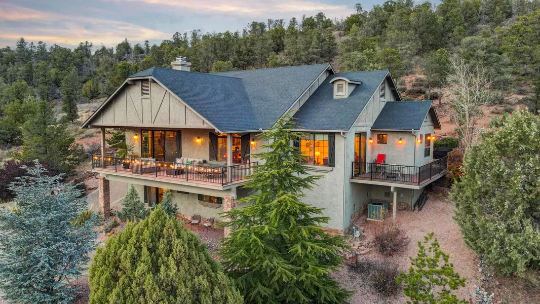 Views, Views, Views! Enjoy stunning panoramic mountain and town views from this lovely single-level hilltop home in the desirable Woodhill subdivision. Set on a private lot surrounded by natural vegetation, this property offers both serenity and scenery. Recent upgrades include new windows, doors, roof, interior paint, and carpeting in the bedrooms. Step inside to a light-filled layout featuring a spacious primary suite with private bath and access to a peaceful patio retreat that offers large backyard with privacy, wildlife and natural habitat. The inviting family room boasts large windows, a stone-accented fireplace, slate flooring, and access to a covered Treks deck—perfect for admiring the Mazatzal Mountains and beautiful Arizona sunsets. The chef's kitchen is a dream with a six-burner gas cooktop, center island, walk-in pantry, ample cabinetry, breakfast bar, and adjacent dining area. A bonus den or hobby room off the kitchen also opens to its own private deck. Additional highlights include two guest bedrooms with shared bath, versatile bonus spaces in the finished basement (perfect for a home office, craft room, or sitting area), and a garage with easy entry/exit via dual parking pads. Home also offers an unfinished, plumbed crawlspace with potential for additional bath or storage. Whether you're relaxing on the deck during monsoon season or enjoying the year-round views, this home offers privacy, comfort, and the best of Payson living—even the steep driveway is easily navigable and worth the climb!