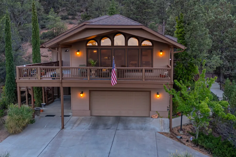 This beautiful mountain home sits on a hilltop, offering sweeping mountain and town views. Step inside to an open-concept layout with floor-to-ceiling windows, a vaulted great room, an eat-in dining area, and a spacious kitchen—all designed to showcase the stunning scenery. The primary suite features access to a large deck, built-in storage, and an en-suite bathroom with a walk-in shower. A guest bedroom, currently used as a studio, includes deck access and a half bath; a shower is plumbed behind the built-in cabinetry for future use. The lower level offers additional living space with a family room, bedroom, and full bath—ideal for multi-generational living or guest quarters. This east-facing home captures beautiful sunrises each morning. Please allow a minimum of one hour notice to schedule your private showing. Main Level is 1335 sq ft and Lower Level is 741 Sq ft. from County Assesso...