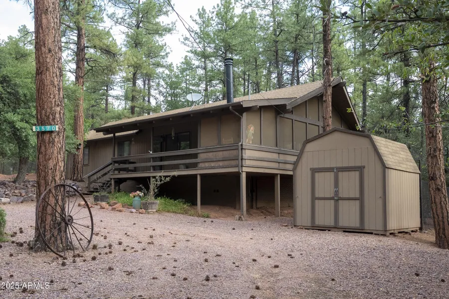 Nestled in the pines of Tonto National Forest, this 3 bed/2 ba cabin is the perfect mountain escape. The remodeled kitchen showcases quartz countertops, alder cabinets, and a farmhouse sink, blending rustic charm with modern style. A gas fireplace and beautifully beamed wood ceilings create that true cabin feel, while multiple decks and a screened porch invite you to soak in the outdoors. New flooring, a large storage shed, new gutters, and a new front door with storm/screen door. The fenced yard is ideal for pets or play. A large buried propane tank fuels the home, central air was added in 2019, and the circular driveway makes access easy. Fully furnished and move-in ready-perfect for cool summer retreats or cozy winter getaways!