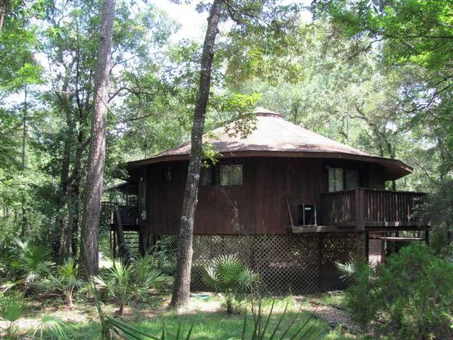 Private airport community with access to community (common) area on the Suwanne River within a very short walking distance. A great spot for picnic/swimming/boating area. This home is a unique 14 sided (round) 2/2 home in good condition.. It is nestled amongst a 1.25 acre wooded lot left in its natural state except where the home sits. This property offers an airplane hangar/barn for any pilot enthusiast. Call to see today! This would make a great vacation get-away or full time living area. Call to see today!
