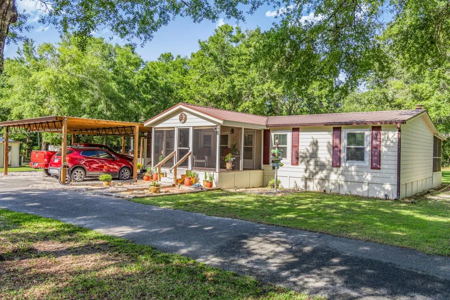 Welcome to your private retreat in Trenton, FL! This charming 3-bedroom, 2-bathroom home sits on 5 beautiful acres and offers the perfect blend of comfort, functionality, and outdoor living. A gated entrance and paved circular driveway provide both security and convenience as you arrive at the property. Enjoy peaceful mornings and relaxing evenings in the spacious screened-in rooms at both the front and back of the home. Inside, the home features a split floor plan with a spacious living area, perfect for gathering with family and friends. The kitchen offers ample counter space and cabinetry, making meal prep a breeze, while the adjacent dining area overlooks the serene outdoor views. The primary suite includes a private bath, and the additional bedrooms are generously sized, ideal for guests or a home office. The home also features a brand-new A/C unit, ensuring comfort year-round. The property is well-equipped with two large workshops and an additional shed, perfect for storage, hobbies, or projects. A dedicated generator with its own gas supply ensures youre always prepared, and the 30-amp RV hookup makes it easy to accommodate guests or your own travel trailer. Nature lovers will appreciate the variety of fruit and olive trees scattered throughout the land, adding to the serene, homestead-like feel of the property. This is a rare opportunity to own a well-maintained slice of Florida countryside with space to grow and room to roam.