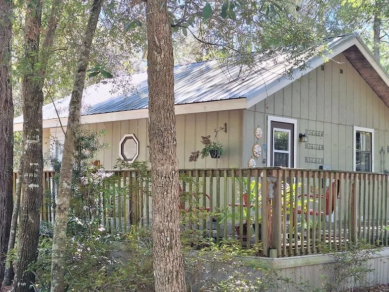 Charming one-bedroom cottage tucked away on over three wooded acres within walking distance of the Suwannee River. A large wrap-around porch welcomes quiet mornings and long evenings outdoors. The home sits at the back of the property, reached by a double driveway and surrounded by trees for privacy. The property is fully fenced and offers plenty of room for a garden, animals or future expansion. Two spacious storage sheds provide space for tools, gear or hobbies. Spanning two lots, there is the option to split for an additional homesite or keep it open for extra privacy. No HOA and not in a flood zone. Take a stroll down a quiet country land to catch the sunset over the river or launch your boat at nearby Log Landing for a day of fishing and exploring. When evening falls, unwind under the wide North Florida sky and enjoy the stillness that only comes from country living. Whether you're looking for a full-time home, a weekend hideway or a property with rental potential, this home offers a quiet escape and room to grow just minutes from the small town of Bell (population less than 600!)