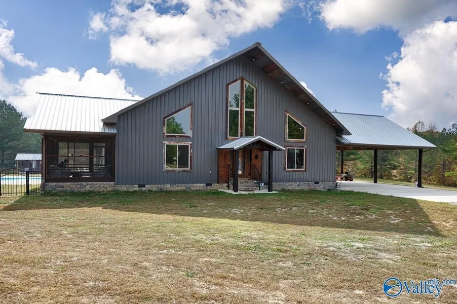 This like new custom 3BR/4BA 3997sf Barndominium has too many extras to list! Each bedroom has its own bath! On the main floor, the expansive living room and kitchen have vaulted ceilings and would be perfect for entertaining or family gatherings. The kitchen has custom walnut counters and a large walk-in pantry. The master bedroom and bath are a true luxury, with a soaking tub, two shower heads in a custom tile shower, and double vanities. There are two additional bedrooms and baths upstairs that also have custom tile showers and one has another soaking tub! Moving outside, the home has metal siding and roof with rock foundation & trim. There is a screened porch, gated pool, and carport.