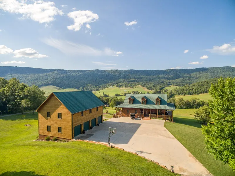 Beautiful 3 level Custom Log Home with plenty of room for many more bedrooms if desired. Main level has modern kitchen, laundry room, great room, huge Master Suite with doors to 2 porches to enjoy the amazing mountain views. Upper level has two very large bedrooms & bath. Lower level has large great room with wet bar and another large living room. Another room can be sewing room or office with huge walk in closet and full bath has claw foot tub. 4 car detached garage and 2 upper levels is all living space.One level has weight room and private office and upper level is all living with full bath. Property is extremely secluded with almost a mile of Walker Creek for great fishing, tubing, etc. A screened room is nearby for enjoyment and a shed for tubes, fishing equipment. 65 acres of pasture & 55 acres of woods with trails throughout perfect for livestock,crops,hunting, hiking,atv's. Pond ...