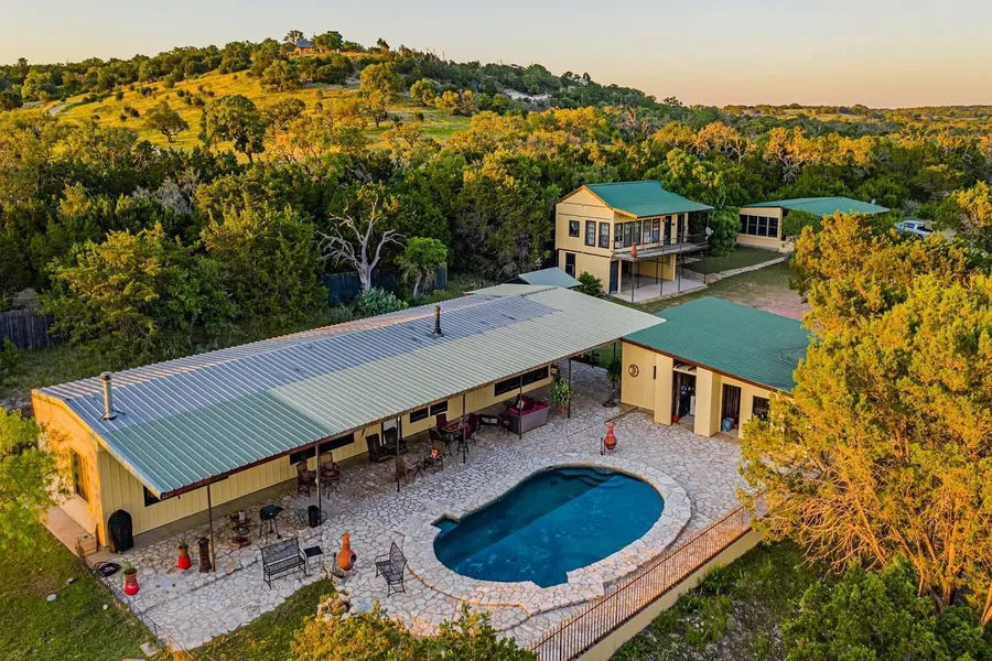 COMMENTS: Rolling hills and panoramic views of the Texas Hill Country grace this property just about eleven and a half miles from Fredericksburg. Next door to Chisholm Trail Winery on a private dedicated road, this Ag-Exempt recreational property holds potential to function as a short term rental space or commercial venture, offering several new-build sites for expansion. The ranch already includes a main house with an office, kitchen, 2 living areas and a bedroom suite. A guest cottage provides additional accommodations. The greenhouse includes an adjacent RV barn which may function as workshop or outdoor kitchen and pavilion. A pool and flagstone patio provides outdoor living opportunities. The land is fenced on two sides, has abundant wildlife and hunting plus a private well.