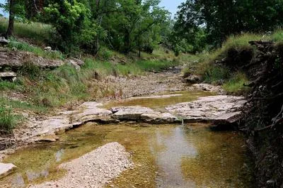 The headwaters of Threadgill Creek eminate from this and adjoining ranches, and a strong spring has always yielded at least a trickle flow, according to previous owners of 50+ years. This spring flows over a solid rock bottom for several hundred yards alongside a gorgeous pecan bottom and ancient limestone cliffs, and has been impounded by a stone and concrete step dam, which is crossable by motor vehicle. The hole is swimmable and floatable, complete with boulder landscaping along the banks, which are shaded by pecan and walnut trees.