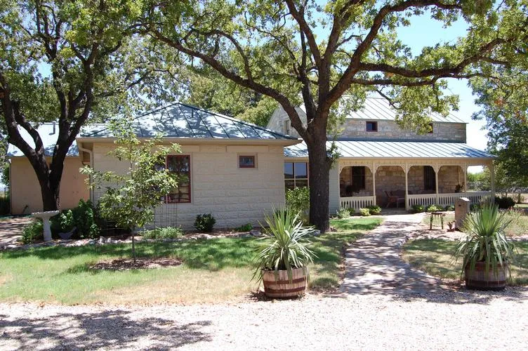 The best of the old with all the bells and whistles of the new is what you will find in this circa 1875 limestone/ Basse block that was restored and added to by award winning contractor Richard Laughlin. Located just outside of town on land that was once owned by the founder of Fredericksburg, John Musebach, this home has features including long leaf pine and stained concrete floors, thick native limestone walls, transoms, custom doors, custom cabinets, vaulted and beamed ceilings, bead board and stained glass. The home is equipped with 3 heating and cooling units. The patio is an entertainers dream come true with covered porches and large oaks. The spacious master suite is a part of the new construction and is enhanced by faux finished walls, stained glass portals, a custom light fixture, antique beams and the doors leading to the master bath are imported from Mexico. The bath has amenities such as double vanity set in antique furniture along with custom mirrors, a large tub by Aquatic (uses air to create a whirlpool type effect), a walkin shower with double heads and a very spacious walkin closet. A corner reproduction antique used as a linen closet will remain with the home. All water heaters (3) in the home are tankless. Along with the limestone, a portion of the home is constucted with Basse Block and some of the exterior is stucco. The oversized detached garage is just steps from the home and has an upstairs that is currently used for storage but would make some wonderful guest quarters. There are several outbuildings providing shelter for equipment, hay and livestock. Excellent fencing,entry gate with operator and Ag Exempt land, paved county road frontage, excellent soils, a complete package ready for you to move in and enjoy today! And best of all, it is only 5 minutes from downtown Fredericksburg!