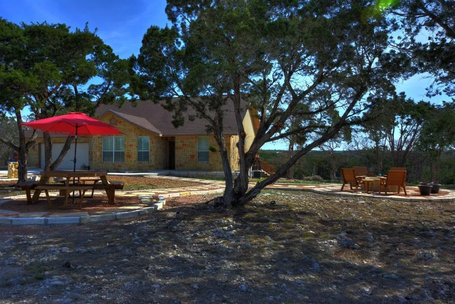 EXCEPTIONAL VIEWS from this rock custom home with open concept living/dining/kitchen featuring high ceilings, plantation window coverings, 18 tile, ceiling fans, & wood burning fireplace. Kitchen offers a wrap-around eating bar, granite counters, stained wood cabinetry, stainless appliances w/ 5 burner stove, touchless faucet, & tile backsplash. The master suite is private w/ spacious bath area to include separate lavatories, separate vanity, granite countertops, garden tub, & large shower/glass door/tile surround. Two guest bedrooms, split, with guest bath. Expansive covered back porch. Crushed granite & limestone trails lead to shady picnic table area & fire pit area where enjoying the Texas Hill Country vistas from every direction is a must. Fenced back yard.