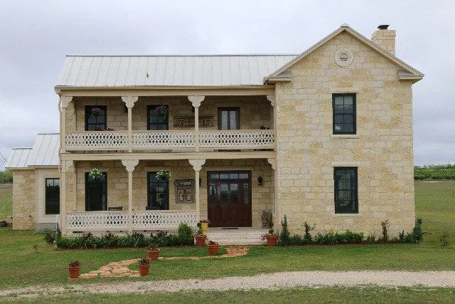 Designed to reflect Hill Country German homes of the past. Exterior is Sisterdale cream limestone. Outside details crafted by local artisans from the lentils above and below the windows and doors to the fretwork cut from historic patterns on the two story porches. Inside, are maple floors milled locally, custom kitchen cabinets, dentil molding in the entry, living room, and dining room, custom arches along the kitchen and family room, and crown molding in the remainder of the house. One fireplace is surrounded with Delft tile while the other has German wine label tiles. Outside is 3,600+ sq ft. of terrace which has limestone planters and porcelain tile. In the planters are pear trees, magnolias, knockout roses and crepe myrtles. Offered with 50 acres of terraced land and a well that produces 100+ gallons per minute. Fields in coastal Bermuda for horses, cattle, or hay production. Perfect...