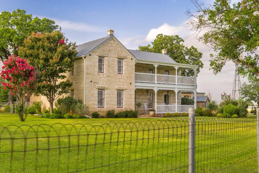 German Stone home that has been beautifully restored on the Pedernales River is 3,815 sf, 4/3/1. It is a traditional Hill Country setting with a Dog Trot guest quarters, 450 sf 2br/1ba, pool, pool house with bath and kitchenette, water storage and cellar detached, windmill, barn (2,3340 sf), barn (360 sf), sheds, crossed fence for horses and cattle. Views of the Pedernales RIver Valley and wine country can be enjoyed from the front porch. Inside the home nothing has been spared, gourmet kitchen, large master bedroom and bath, cedar walk in closets, separate dining room, living room, and upstairs guest bedrooms.The quiet countryside of Fredericksburg can be enjoyed from this beautiful 1906 German homestead.
