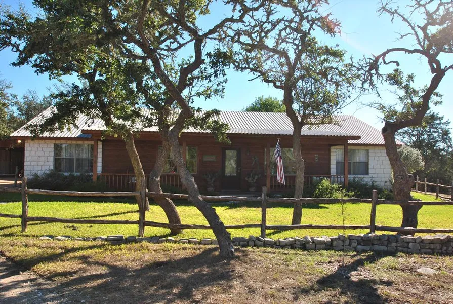 HILL COUNTRY STYLE HOME nestled on 4.64 acres. Enjoy a country setting minutes from Fredericksburg. Views are invited in from the many windows and from the wonderful back and front porches. Open floor plan that encompasses large living area with wood burning fireplace, a spacious kitchen with breakfast bar, dining large enough for any family and nice size utility room with wash/mud sink. Laminated wood, stained concrete and carpet for flooring. All within 9 miles of historic Fredericksburg Texas. Property is perimeter fenced with storage and workshop out buildings. Home is move in ready.