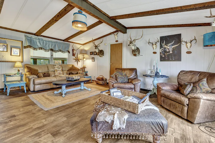 The home is a cute 3/2 manufactured house with nice updates, including a spacious glass addition that provides an additional bedroom and second living area with a lovely stone fireplace for those chilly Texas nights. The property also has a detached 2-car garage that could be converted into a workshop or extra storage space.
