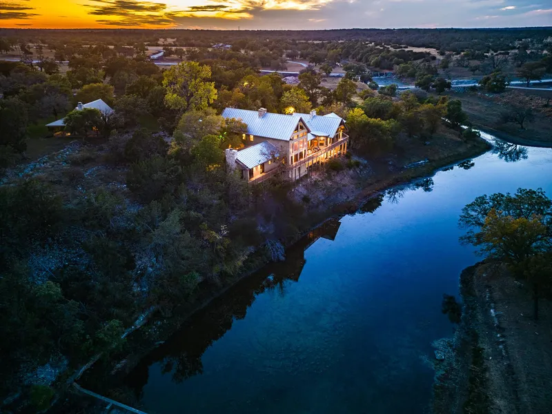The Lake House: surrounded by 21.14 acres of mature live oaks, live water, exotic wildlife and rolling terrain, this unique 3-story 8,384 sqft 5 bed 6 bath Ranch Home with Guest House, sits hilltop with an expansive wrap-around deck overlooking its private lake with mile-long creek views. 2 spring-fed converging live water creeks, Klein Branch and Stevens Creek, intersect home-front where a large concrete dam gives this property a beautiful year around lake.