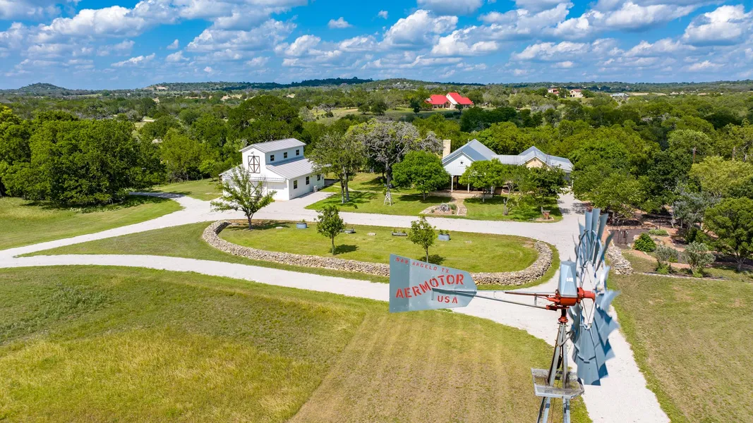 Nestled along the picturesque Bear Creek just South of Fredericksburg, The Bear Creek Estate offers a harmonious blend of timeless charm, modern amenities, and natural beauty. The recently renovated main house features exquisite wood ceilings, an open concept living space, and a kitchen designed for entertaining with granite countertops and a wet bar. French doors open to a back porch overlooking the creek, while the master suite boasts wood ceilings, a soaking tub, tile shower, walk-in closet, and a private deck. The main home encompasses 4 bedrooms, 3.5 baths, high ceilings, walk-in closets, and a security system, this retreat effortlessly balances privacy and ranch-cottage architectural style.