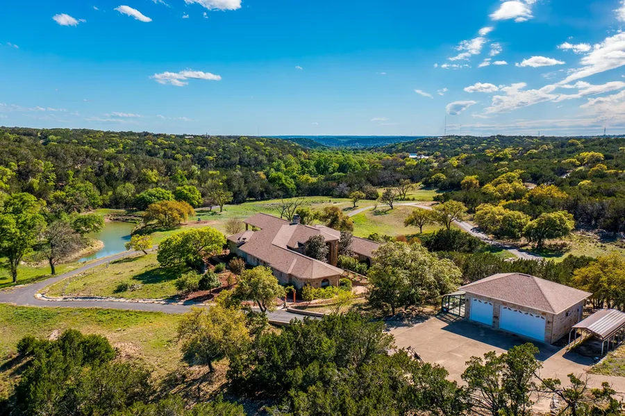 AG Exempt! Rambling Creek Ranch is a picturesque 203.21 acre property nestled in the captivating Hill Country landscape, just 20 minutes northeast of Downtown Kerrville. The ranch boasts a beautiful native stone home spanning approximately 5600 sq ft. It offers grandeur with an arched stained glass entryway, 18-foot cedar ceilings, and a cozy gas fireplace. Floor-to-ceiling windows capture the southwest scenery, leading to a covered porch. Inside, there are two master suites and two guest bedrooms, each with its own en suite bathroom. Additional features include a separate office, gourmet island kitchen, utility room, central vacuum system, and an attached 3-car garage. For added versatility, there's also a detached 2-car garage with HVAC and a bathroom, along with an attached greenhouse. Partly wooded with oak and elm trees, high-fenced on 2 sides, and offers breathtaking views and building opportunities. A tranquil pond, fed by natural springs, attracts Canadian geese and ducks, offering a serene spot for relaxation. Meanwhile, a deep 400+ ft well ensures a steady water supply, producing 25 gallons per minute. The ranch boasts a diverse array of wildlife, comprising axis deer, whitetail deer, hogs, turkey, and more. The ranch's prime location and unparalleled features makes it an ideal place to gather with family and friends for endless outdoor adventures with excellent hunting away from the city. Rambling Creek Ranch is a rare opportunity to own a piece of the Texas Hill Country's natural beauty.