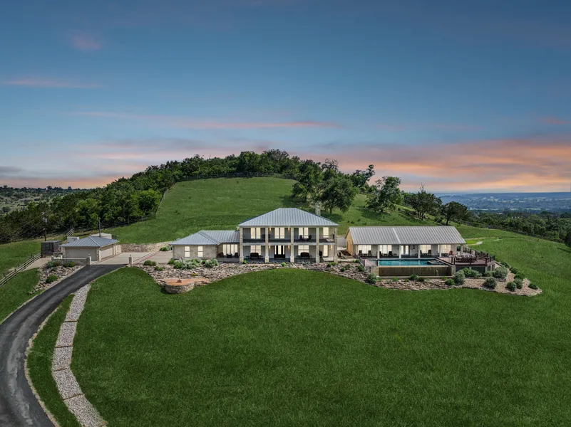 Luxurious hilltop estate home with guest house on 14+ acres with some of the most stunning views in Gillespie County. Both the main house and the guest house were completely rebuilt in 2004 to discretely become ADA friendly, including an elevator for accessibility. Infinity edge pool and spa overlook the breathtaking views. Elegant finishes throughout the home including wood flooring, custom cabinetry, built-ins, and a wet bar and fireplace in the great room. State of the art technology allows for control of lighting, security and pool from your smartphone. Sophisticated master suite with fireplace, double vanity, garden tub, exquisite tilework, and a gigantic custom closet, all topped off with balcony acces...