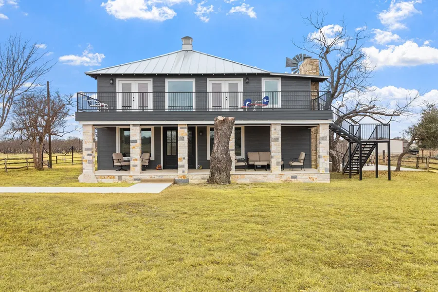 Located along the Texas wine corridor & set on 12.5+/- AC is the original Wiemers homestead which has been immaculately & tastefully taken down to the studs, expanded & recreated as a 4BR/ 3.5BA home to provide modern day comforts while still maintaining the Fredericksburg charm. Locals will recognize Fred the Bull which is often decorated & watches over Old San Antonio Road. Features inside the home include a generous great room complete w/ a stone fireplace, gorgeous granite counters, stainless appliances in the kitchen, a butler's pantry w/ custom shelving, laundry room, tile & laminate flooring & high ceilings throughout. An oversized primary suite w/ a walk-in closet & balcony access, 2 water heaters & a water softener, an oversized 2 car garage w/ a separate store room, and so much more. An unfinished basement area could possibly become a wine cellar. Exterior features include a quintessential windmill, chicken coops, a potting shed/landscaping storage, a huge custom stone patio perfect for entertaining & an 8-person hot tub. In the evenings enjoy a beverage on the balcony while you watch the Hill Country sunsets & native wildlife. Just 10 minutes to FBG & wineries.
