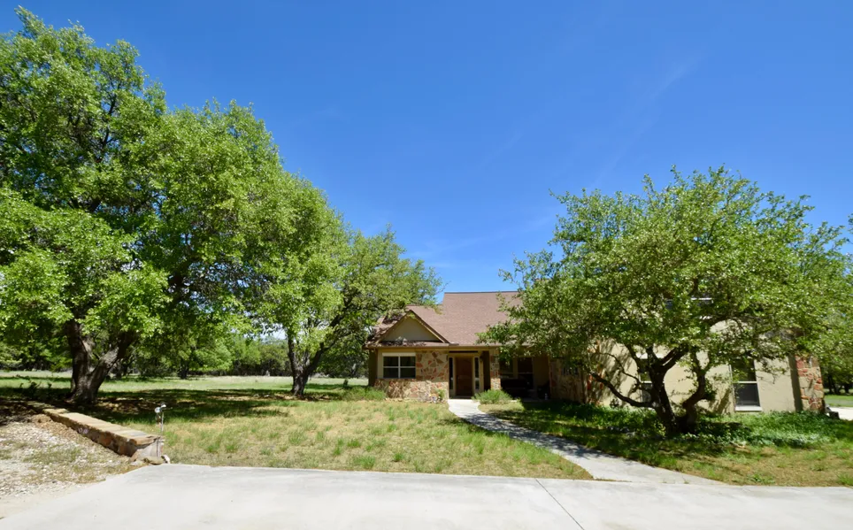 Beautiful Hill Country Rock home on 20, horse-friendly AC. High beamed ceilings, floor to ceiling rock fireplace w/ lots of windows to capture outdoors & natural light. Well appointed kitchen offers black granite counters, deco tile backsplash, pretty wood cabinets, rock vent-hood, island, pantry, bar, open to dining room, & views to outdoor covered porch for additional dining & entertaining. Huge master suite offers exquisite claw-foot soaking tub, large shower, walk-in closet, & private porch. Split floorplan w/ guest rooms share a walk-thru bath. Separate formal dining room/den w/views to front covered porch, wide foyer, & office w/built-in desk & shelves. Large utility room offers good storage, sink, & room for extra refrigerator or freezer, full bath off of back hallway. Upstairs includes a bedroom, bath, media/ recreation, & large accessible floored storage. Oversized garage, centr...