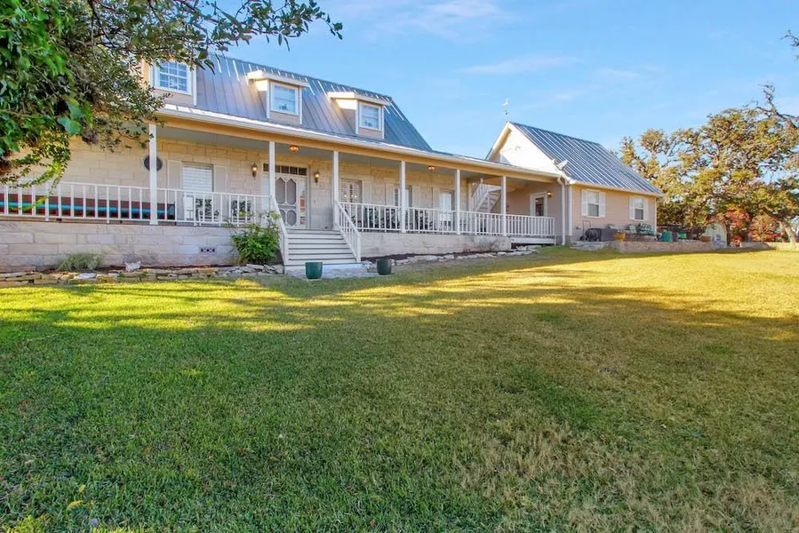 Enjoy sweeping views of the 290E wine corridor & downtown Fredericksburg from this Hill Country style home sitting high on the hill only 2 mi. to Main St.Downstairs of this 2 story stone home are a lg primary suite w/ a seating/office area & en suite, spacious great room complete w/ a stone wood-burning fireplace, French doors & lots of windows giving natural light.An open concept for entertaining between kitchen, dining, den area.Two BR & 1 BA upstairs.Storage.Over the 2 car detached garage is a lg room.Relax & watch the native wildlife from the expansive front porch or 1 of the back decks.