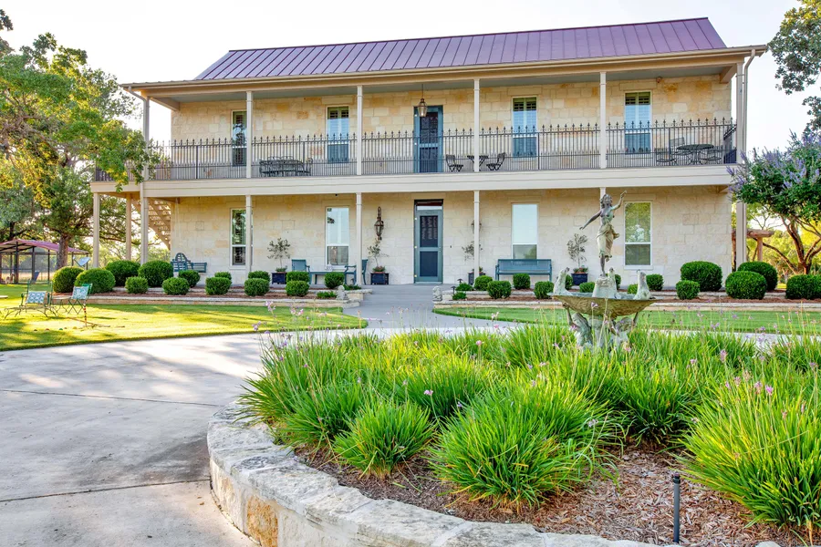 Captivating 26+/- acre Waterfront Estate nestled along the Texas Wine Trail and Pedernales River in the Heart of Hill Country. 2000+/- feet of pristine river frontage with gently swirling rapids over limestone escarpments in a serene park like setting. Situated among towering shady Post Oaks, an exceptionally well crafted 4087+/- sqft 4 bedroom, 3.5 bath main house encompasses the historical character of early German Settler architecture and ornate French Creole charm. 1920+/- sqft 2-Story log cabin boasts a stellar drive-thru workshop and spacious 3 bedroom, 2 bath guest accommodations with soaring view of the Pedernales River and rolling Hill Country. Luxurious outdoor living fit for grand entertaining features an impressive arched masonry fireplace and enchanting pergola adorned with a blooming vine and the serene sounds of the flowing water fountain. Fully fenced with a wildlife exem...