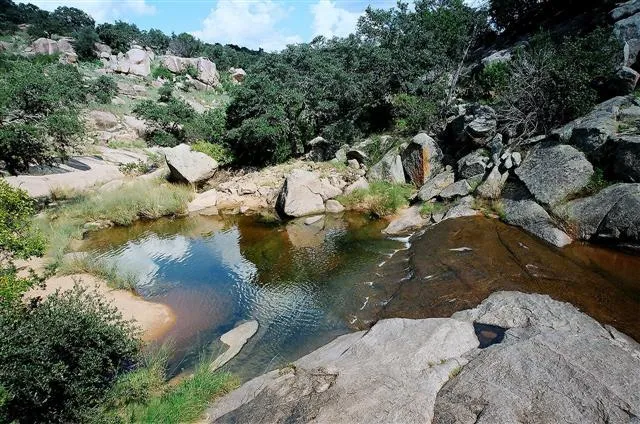 Several hardwood bottoms are found along Sandy Creek, adding a touch of refinement that is welcome in this rugged environment. A seasonal waterfall of some 20 feet is near the eastern border, and other, smaller waterfalls are common during wetter years. The springs also create enchanting water features, with ferns, rock algae and wild onions amongst the accompanying flora.