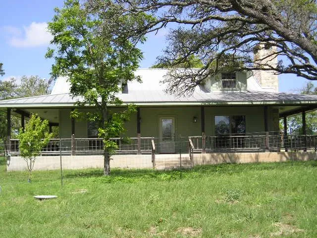 Very cute one-story ranch-style country home (built 2005) on 6+ acres with beautiful WOLF CREEK. Eight-foot wide covered porch three sides offers nice views of the Texas Hill Country and the creek valley. Hardy-plank construction / metal roof. 1560 square feet as per appraisal district records. Concrete slab foundation. All electric. Private water well drilled in 2004 - 233' deep, 27 GPM. Licensed aerobic septic system. Great tree cover - varieties of oaks. Three bedrooms / two baths. Living room with rock fireplace. Open Kitchen/Dining/Living room with high ceilings - lots of windows and natural light. Breakfast bar - plenty of wood cabinets, pantry. Nice master suite - bath with garden tub/shower and walk-in closet - access from bedroom to porch. Bedrooms carpeted - rest of home wood laminate flooring. Recessed lighting and ceiling fans throughout. Room measurements available upon req...