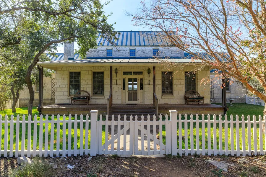 Ranch located 6.5 miles from town on Ranch Road 965. The 136.7 acres has pond, diverse terrain and tree cover, nice views. The custom built, limestone veneer main home has 3252 sq. ft. with 4 bedrooms and 3.5 baths. The full length front porch, full length upstairs and downstairs back porches have Ipe (ironwood) decking. Home also features high ceilings, great room, living room, 2 fireplaces, butler pantry, and wood floors throughout.
