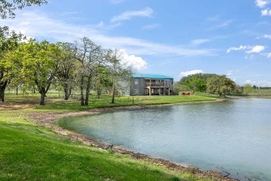 This Barndominium on 23.888 acres less than 3 miles from Main Street is a one of a kind must see. Enjoy the comforts of country living w/in reach of shopping, restaurants, schools & more. Take in the morning sunrise on your porch, & enjoy star gazing sitting around your firepit in the evening. This impressive property features two ponds, a seasonal wet creek, many trees & wildlife. This custom-built barndominium blends rustic charm w/ modern elegance. The interior w/ three bedrooms & three baths (one bedroom downstairs & two upstairs each w/ its own en-suite bathroom) is astonishingly spacious & thoughtfully designed. The living room is warm & inviting w/ French doors, a corked ceiling, shiplap walls & an electric fireplace. A built-in home office is included w/ plenty of cabinet & shelf space. The kitchen is equipped w/ ample counters, cabinets & with a pantry. The open layout graciously connects the kitchen to the dining area, providing a pastoral view of the pond. A one bay garage is attached w/ ample space for an RV or anything you need stored. The estate is ag exempt and located in the ETJ, very minimal restrictions, providing endless possibilities for (YOU) the new owner!