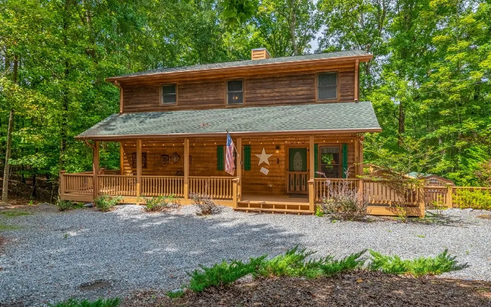 Your mountain escape is here! This beautiful mountain retreat has a huge wraparound porch & deck overlooking the wooded setting & outdoor firepit providing ample gathering spaces for taking in the outdoors. Cabin is log-sided & offers a pleasing mixture of tongue & groove and drywall, soaring cathedral ceilings, floor to ceiling stone fireplace, 3 bedrooms a large Loft overlooking the living room, & kitchen w/granite & stainless appliances. The terrace level has a family game/tv room, bedroom & bath, patio area w/ picnic tables & hot tub. Garage on basement level. This beautiful mountain community offers gated entrances, walking paths & trails, river access, canoe & kayak launch areas, ponds, swimming pools, & fitness center. Active cabin nightly rental. Sold furnished.