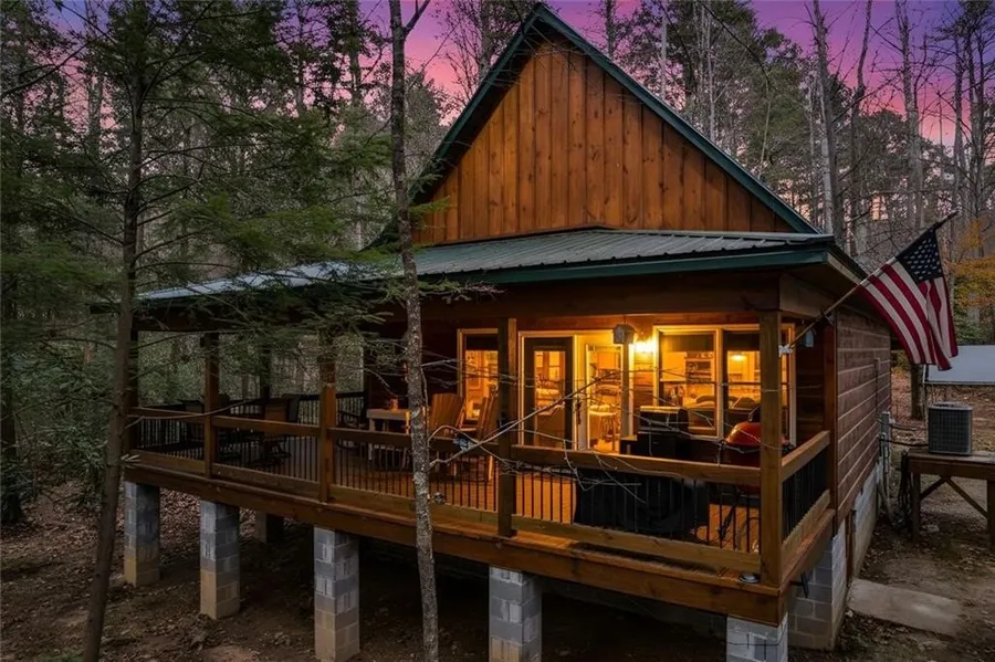Experience refined mountain living at this exceptional creekfront retreat, perfectly positioned on 1.02 acres of unrestricted, private land with an extraordinary 404 feet of Vandegriff Creek gracing the boundary line. This property blends the serenity of nature with elevated craftsmanship, creating a rare offering for a buyer seeking both escape and sophistication. A striking 830+ sq. ft. covered wraparound porch sets the stage for elevated outdoor living, morning coffee by the creek, evenings by the grill with a dedicated exterior gas hookup, and relax to the surrounding nature sounds. A 30 AMP RV hookup with water and septic expands your hospitality options, while the full concrete-floor crawl space offers secured storage for gear, equipment, or a future workshop. Inside, the cabin features an elegant mix of rustic charm and modern finishes. The soaring wood interior is warm and inviting, complemented by granite countertops, wood-grain porcelain tile, and a dramatic stacked-stone gas fireplace that anchors the great room. Natural light pours through French doors, creating a seamless flow between indoor comfort and outdoor tranquility. This location is unmatched-surrounded by the most coveted outdoor destinations in North Georgia: Amicalola Falls State Park, Noontootla Creek Farms, Springer Mountain, Blue Ridge and Rich Mountain WMAs, the Appalachian Trail, and the Benton MacKaye Trail. Award-winning wineries, boutique dining, and endless trout waters and hiking trails lie within easy reach. And with Hartsfield-Jackson International Airport only 1.5 hours away, this retreat is remarkably accessible for weekend escapes or full-time living. A rare opportunity to own creek frontage, unrestricted usable land, and a beautifully appointed cabin in one of North Georgia's most celebrated outdoor corridors. This property offers the privacy, prestige, and lifestyle you desire! Schedule a showing to experience the mountain creek magic for yourself today!