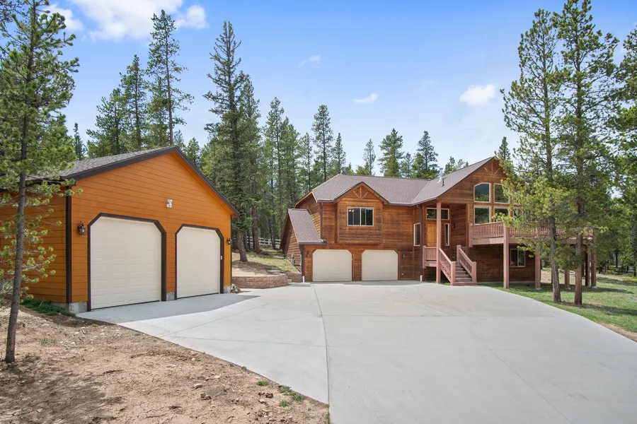 This well-maintained 3 bed, 2.5 bath Gilpin County home sits on a large, flat 5.6-acre lot in a quiet, peaceful mountain setting in Golden Gate Canyon. The main level is open and bright with a beautiful stone fireplace and access to the large deck. The living/dining area expands into the kitchen, which includes new stainless-steel appliances, granite counters, and a breakfast bar. The main level also has a 1/2 bath and a large master bedroom with a 5-piece bath with a jetted tub and a large walk-in closet. The lower level has a second living area, 2 bedrooms, and a full bath. The home includes numerous mechanical upgrades such as a 98% proficient Trane furnace, a whole-house humidifier, an on-demand hot water system, and an owned 1,000g propane tank. The property also has a 2-car attached garage, 2-car detached garage with ample storage, a Tuff Shed, plenty of additional parking for RVs ...