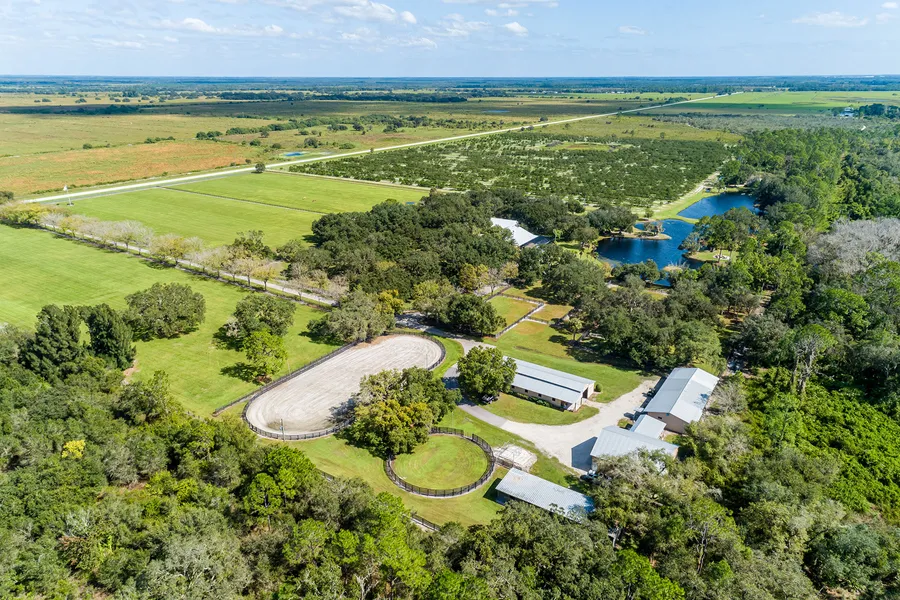 The ultimate family equestrian compound or weekend getaway. Golden Oaks Ranch's 65 acres are a serene retreat to take in all the beauty of SWFL. Be sure to click the virtual tour for a cinematic video experience. Your entry through the gated, oak-lined drive sets the tone for the elegance of the home and the grandeur of the surroundings. The ranch house was totally remastered with all the modern luxury comforts of high-level finishes, and the new carriage house with a 3-car garage, inviting wraparound and screened porch connects the two residences. Combined, featuring 6 bedrooms, 2 dens and 2 living room areas. Between the ponds and the palmetto trail, the grove cottage is tucked away near the 25-acre orange grove. The orange blossoms will illuminate your senses. The equestrian facility has a stunning center aisle barn, office, feed room, wash rack and an additional shed row barn to potentially bring you 19 stalls. Oversized garages, outdoor arena and round pen, pastures and turn-out areas. Minutes to Historic LaBelle and drivability to both Fox Lea and Wellington Equestrian centers. Country comfortable but city close, there is easy access to nearby private airports and RSW.