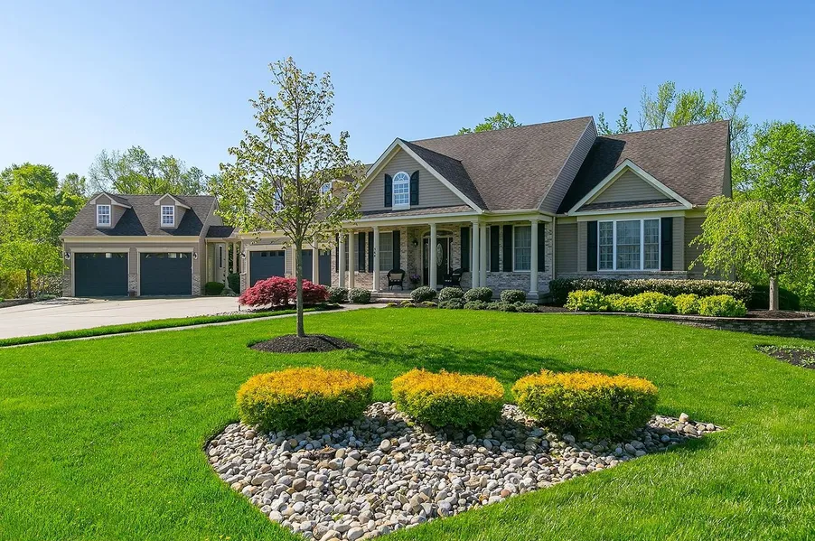 LOCATION,LOCATION,LOCATION!This Beautiful One of a Kind Ranch is nestled at the end of a quiet Cul de Sac and Backs up to tree filled dedicated open space. This Home has it ALL! Let's start with the 4+ Car Garages and a driveway that can fit 10 Cars! Walk up the EPHenry Walkway to a front porch that runs across the majority of the house.Enter into the formal Foyer with Hardwood Floors and Crown Molding.The custom Wide open layout allows you to see most of the main floor. To the left,the Formal Dining Room, to the right your Formal Living Room, both have Hardwood flooring, Crown Molding and Custom Wainscoating.Enter into your GreatRoom, again with Hardwood Floors,Crown Molding, Gas Fireplace and built in surround sound system. The Kitchen is sure to delight any Cook with all Stainless Steel Appliances, Double Oven, Gas Cooktop, Quartz Countertops,9ft Center Island, and 12ft Breakfast bar....