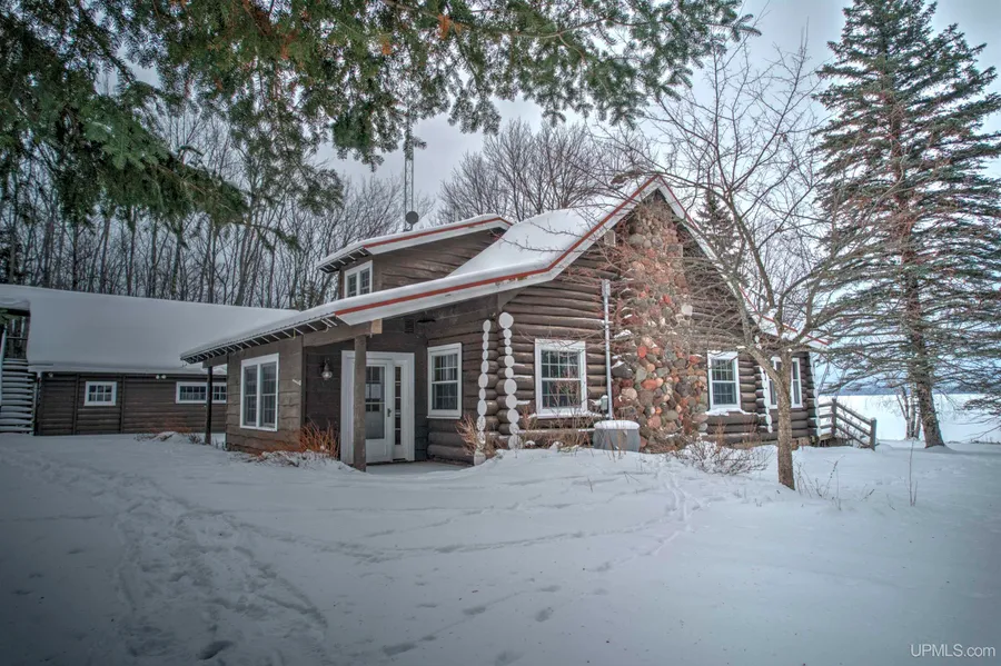 Nestled on the largest interior lake in the Upper Peninsula of Michigan, this rare 3-bedroom, 2-bathroom log home offers a perfect blend of rustic charm and modern comfort. Set on a sprawling 4.45-acre estate, the property boasts generous lake frontage on the majestic Lake Gogebic, ensuring breathtaking views and a tranquil retreat from the hustle and bustle of daily life. The home's interior features a welcoming layout that invites relaxation. The living room features a fireplace and easy access to the entry, kitchen, and porch / deck. The kitchen features an efficient layout and a peninsula. The large, open, and bright front porch leads out to a deck and beautiful lake views! Each bedroom, including one on the main floor, is thoughtfully designed, providing a comfortable and private haven for rest. The two bathrooms, one on each floor, are well-appointed, ensuring convenience and style. A substantial detached garage complements the property, offering ample space for vehicles and outdoor equipment. Adjoining the garage, a versatile workshop space presents endless possibilities for hobbies, crafts, or additional storage. The real gem of this property is its expansive outdoor space. The over 4 acres surrounding the home offers a peaceful setting, ideal for nature lovers and those seeking space. The lakefront access opens up a world of recreational activities, from fishing and boating in the summer to ice fishing and serene walks in the winter. Not to mention snowmobile trail access across the lake! This property is not just a home, but a lifestyle, offering a unique opportunity to immerse oneself in the natural beauty of Lake Gogebic while enjoying the comforts of a well-crafted log home. Whether as a year-round residence or a seasonal getaway, this home promises a life of peaceful enjoyment and picturesque memories.